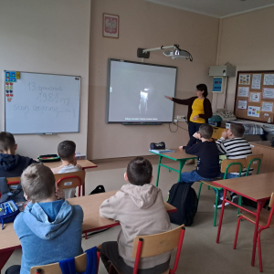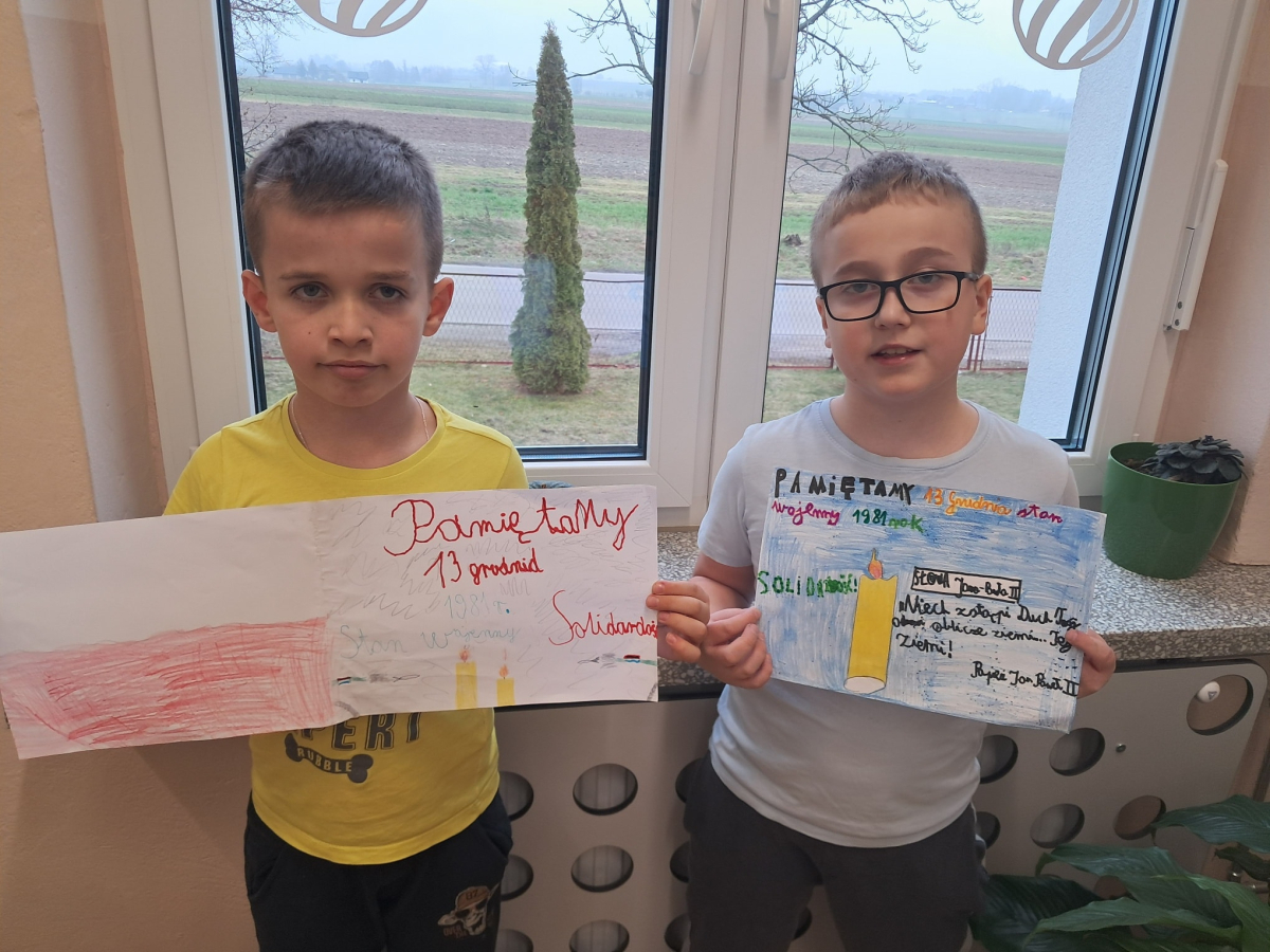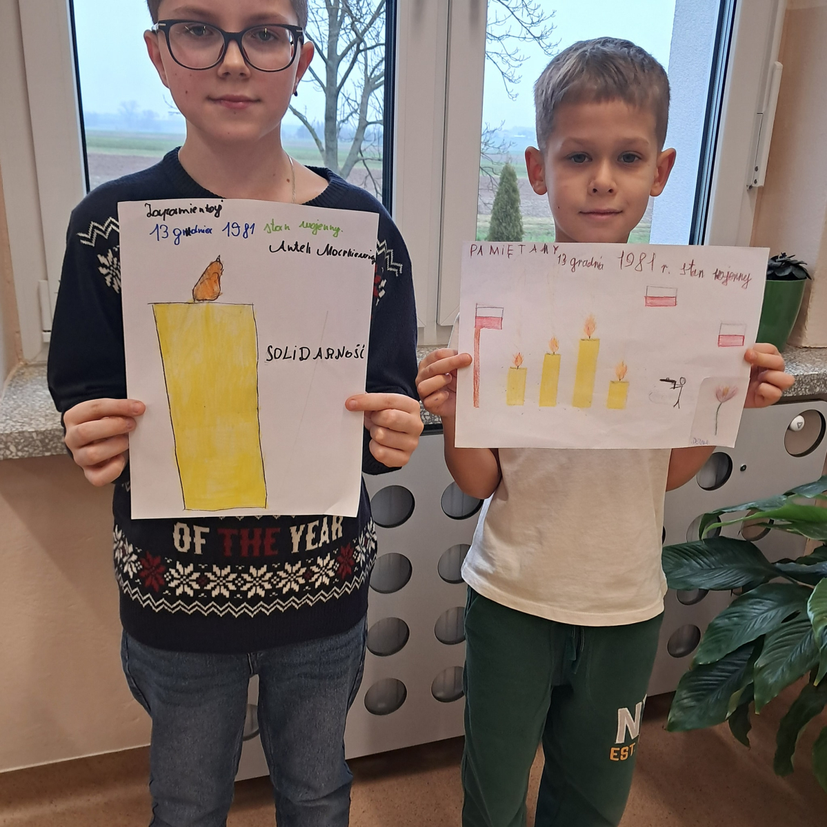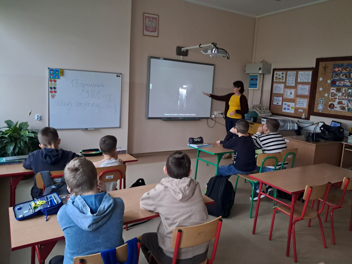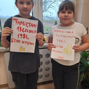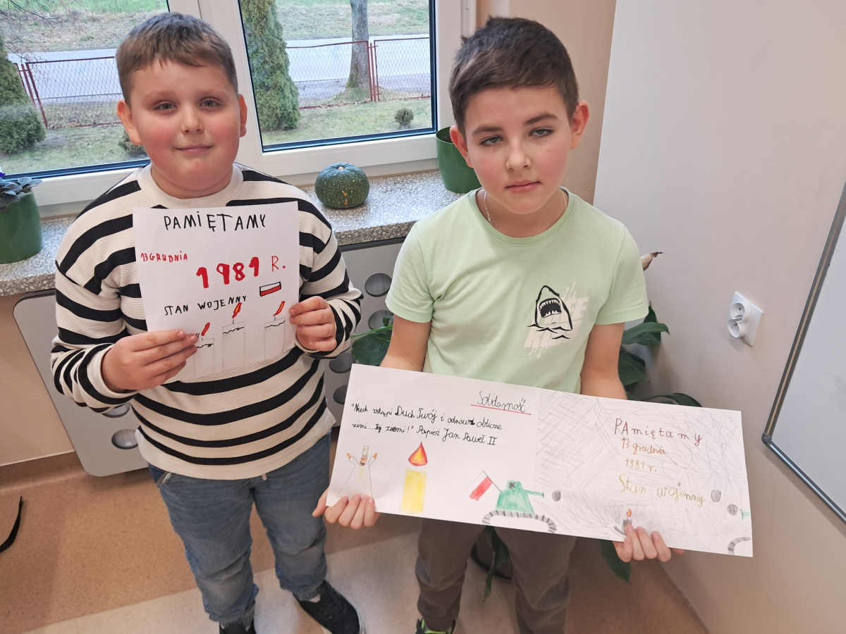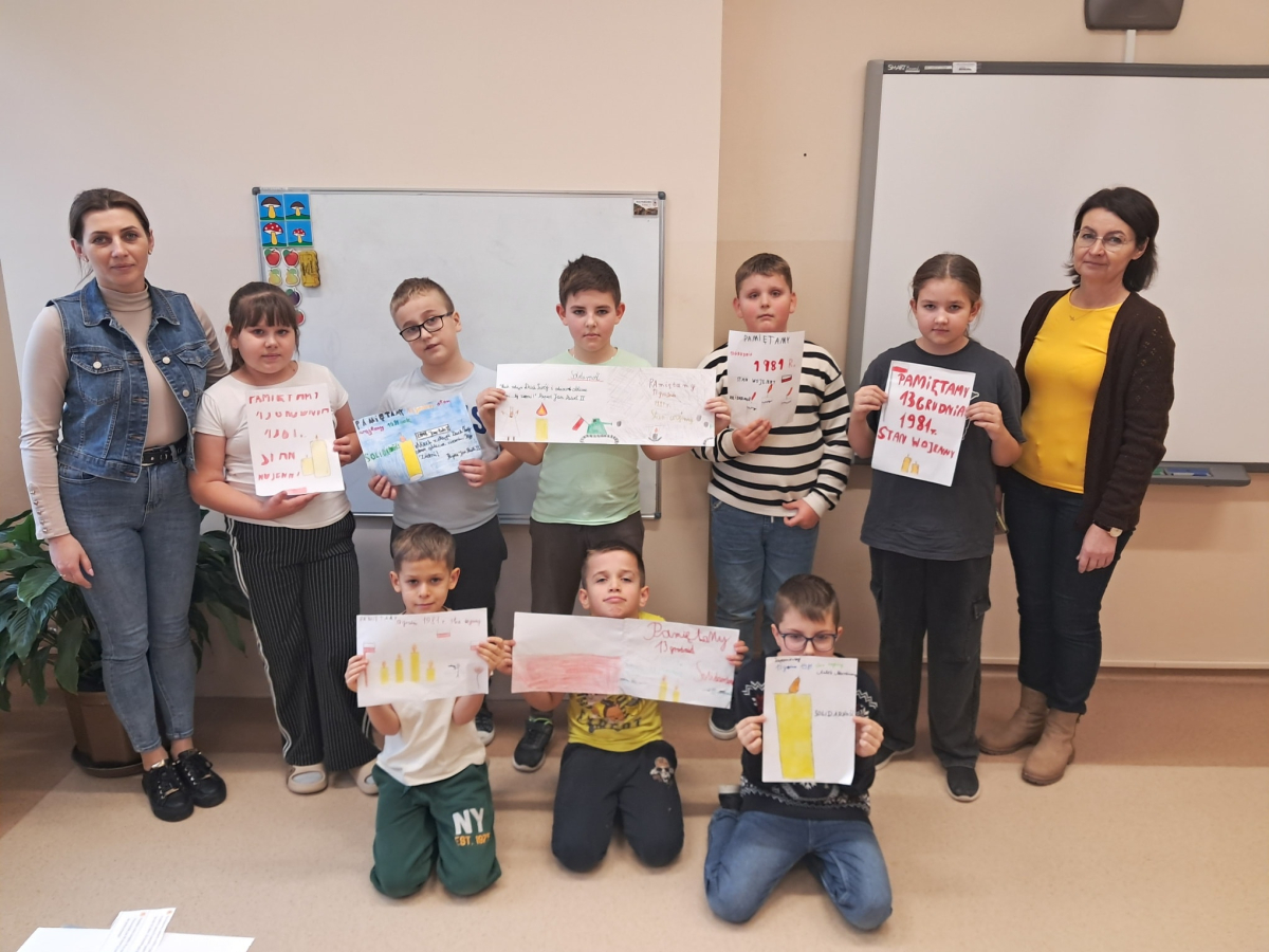 Uczniowie klasy III wzięli udział w lekcji poświęconej 44. rocznicy wprowadzenia stanu wojennego w Polsce. Podczas zajęć obejrzeli film „Światło wolności” ze zbiorów IPN oraz wysłuchali opowieści pani Małgosi, nauczycielki historii w naszej szkole. Uczniowie poznali najważniejsze daty i postacie związane z tym okresem historii. Na zakończenie wykonali plakaty przedstawiające świecę jako symbolu wydarzeń stanu wojennego.