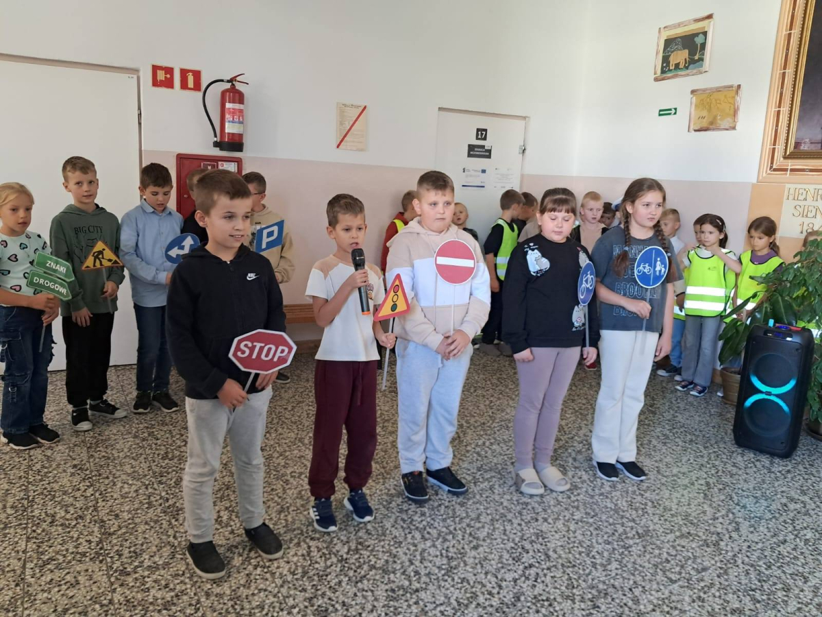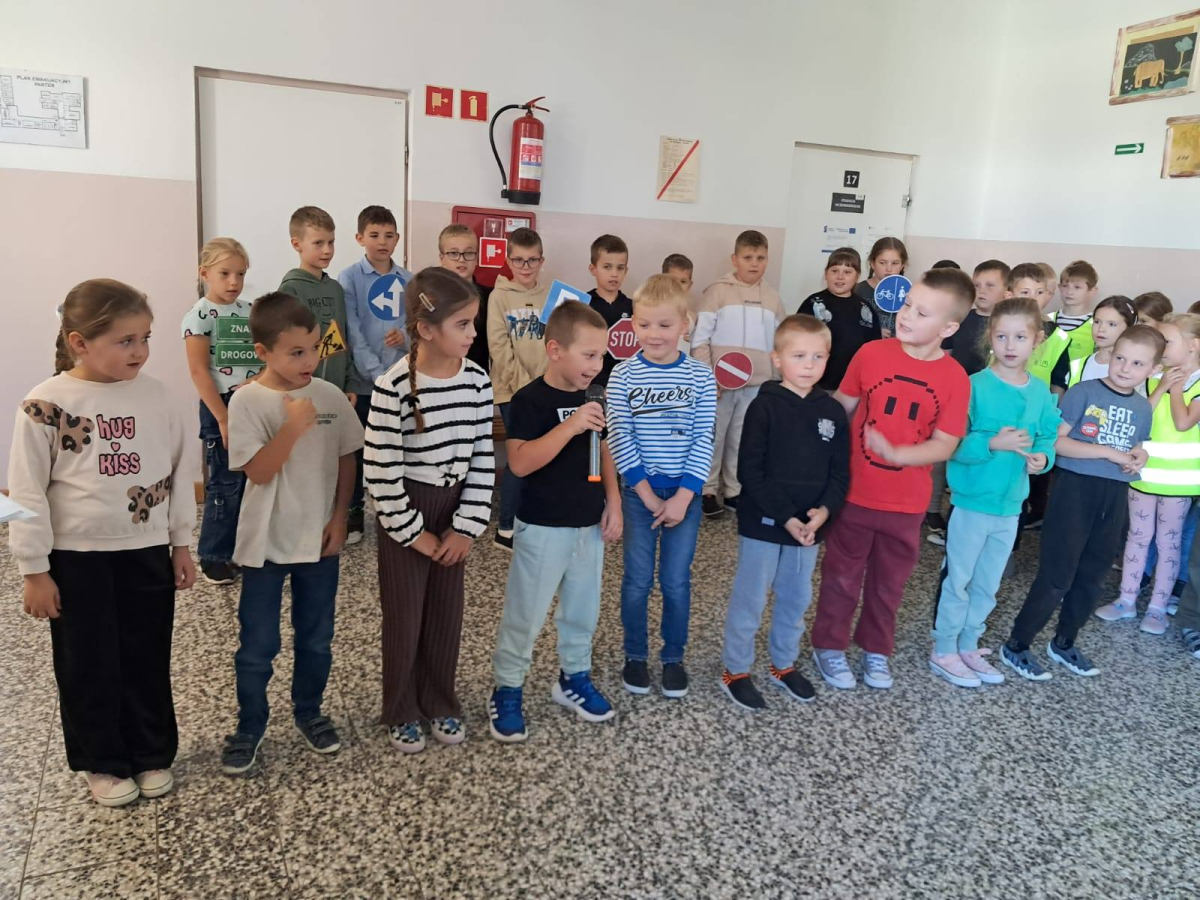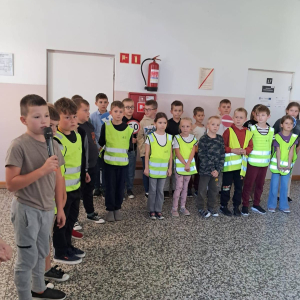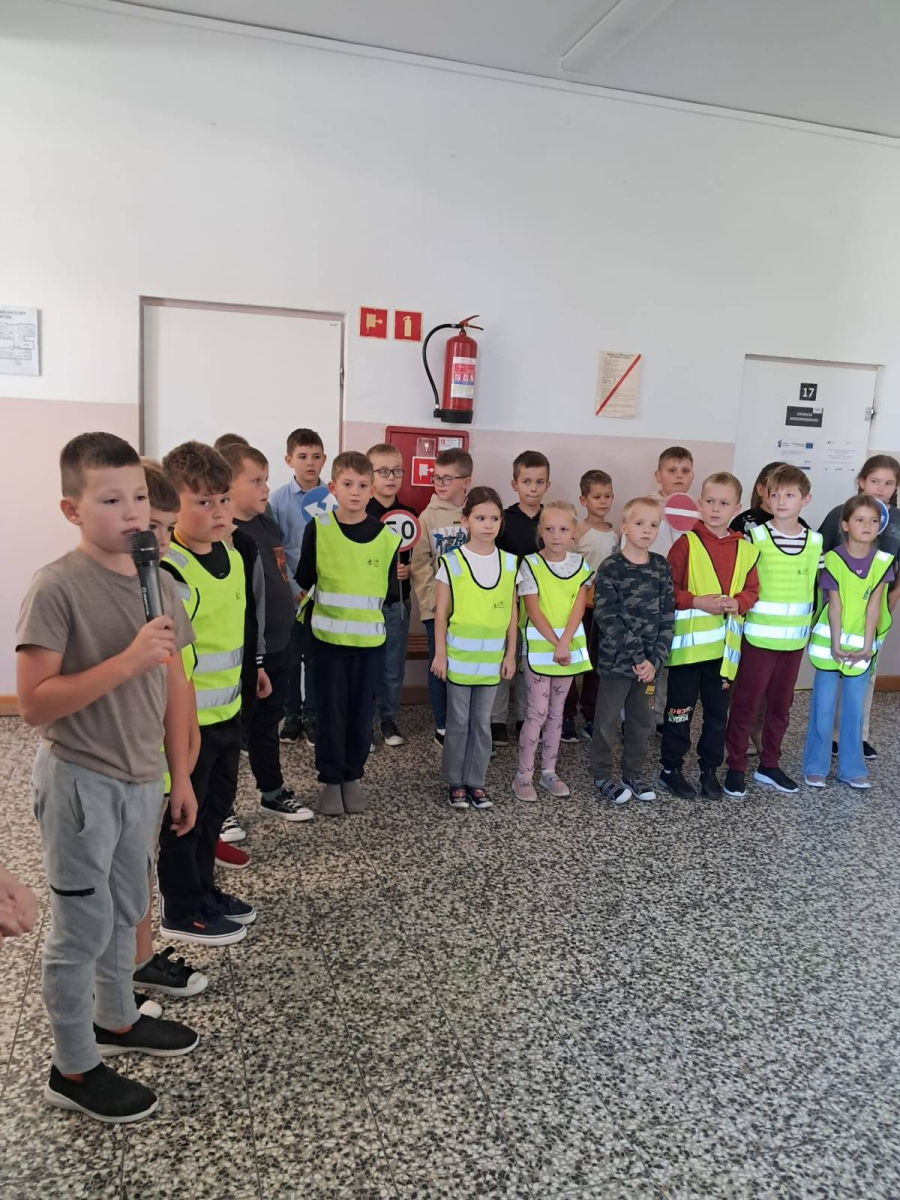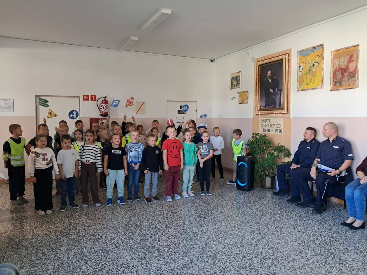 2 października 2025 r. w naszej szkole odbył się apel pod hasłem „Bezpieczna droga do szkoły”. Uczniowie klas I–III zaprezentowali część artystyczną, w której przypomnieli zasady bezpiecznego poruszania się po drogach. Następnie policjanci z Komendy Powiatowej Policji w Rykach przeprowadzili interesującą prelekcję, podczas której zwrócili uwagę na podstawowe zasady bezpieczeństwa na drodze, omówili sytuacje mogące stwarzać zagrożenie oraz podpowiedzieli, jak im zapobiegać. Poruszyli również temat odpowiedzialnego korzystania z Internetu i przypomnieli, jak ważne jest noszenie elementów odblaskowych, które zwiększają widoczność pieszych. Na zakończenie przedszkolaki otrzymały odblaskowe opaski, które będą im towarzyszyć w drodze i zwiększą ich bezpieczeństwo.