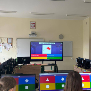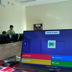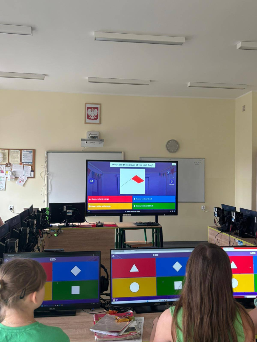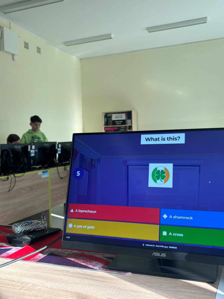 Dużym zainteresowaniem cieszył się również quiz w aplikacji Kahoot, w którym uczniowie mogli sprawdzić swoją wiedzę o Irlandii w formie zabawy. Rywalizacja była pełna emocji, a jednocześnie sprzyjała nauce i integracji.