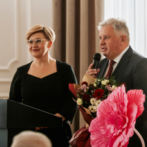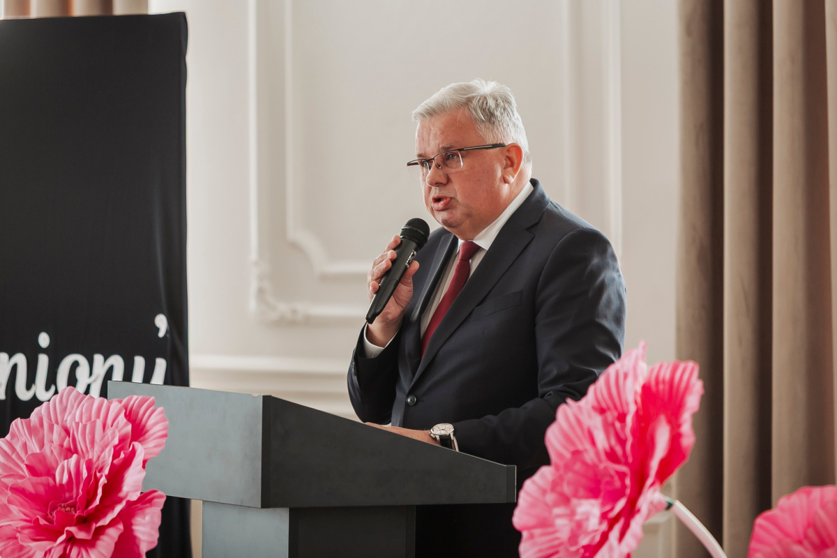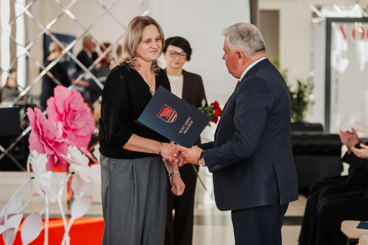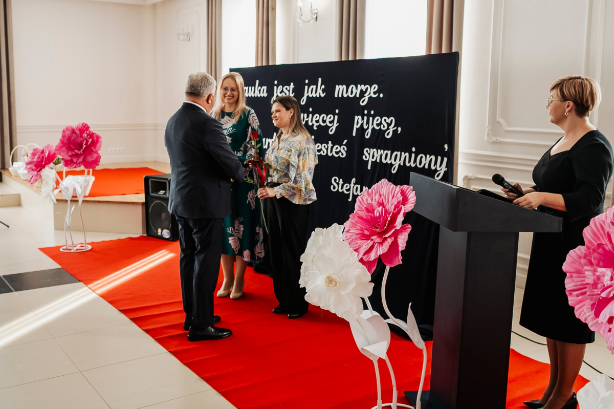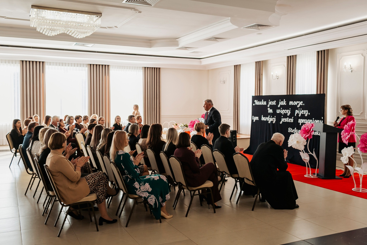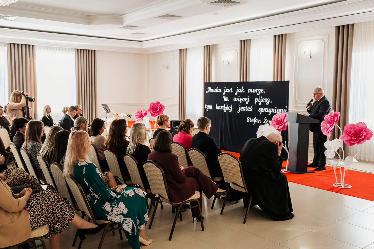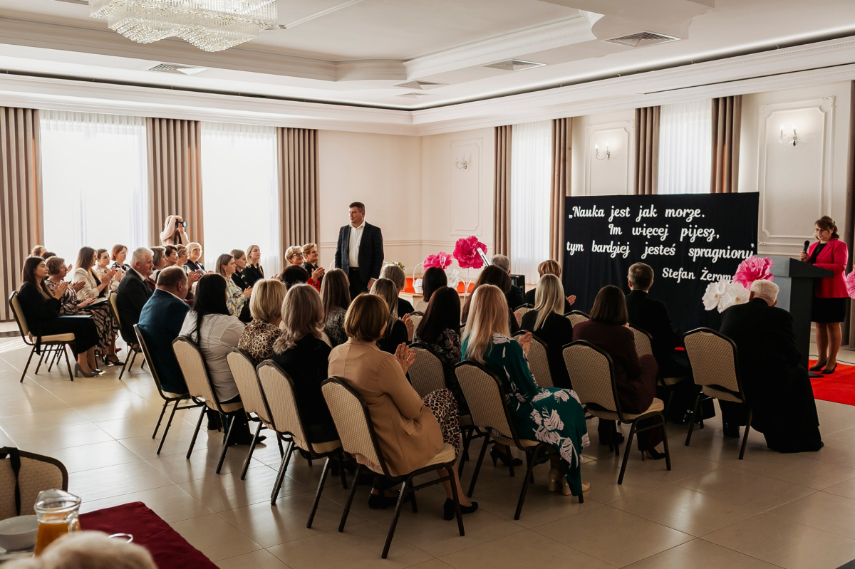 Następnie głos zabrał Pan Zenon Stefanowski- Wójt Gminy Kłoczew, który w swoim przemówieniu podkreślił ogrom pracy, jaki w ostatnich latach został wykonany w gminnych placówkach oświatowych. Mówił o licznych inwestycjach, modernizacjach szkół, doposażeniu sal lekcyjnych oraz o tym, jak istotne jest tworzenie nowoczesnych i bezpiecznych warunków do nauki. Z uznaniem odniósł się do pracy dyrektorów, nauczycieli i wszystkich pracowników oświaty, dziękując im za zaangażowanie i serce wkładane w codzienną edukacyjną misję.