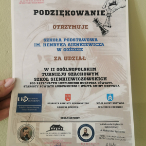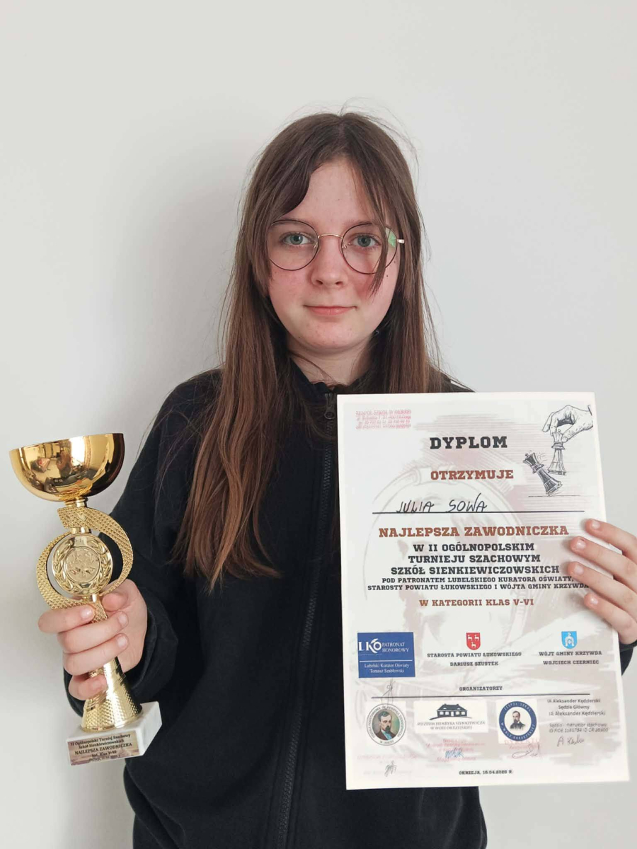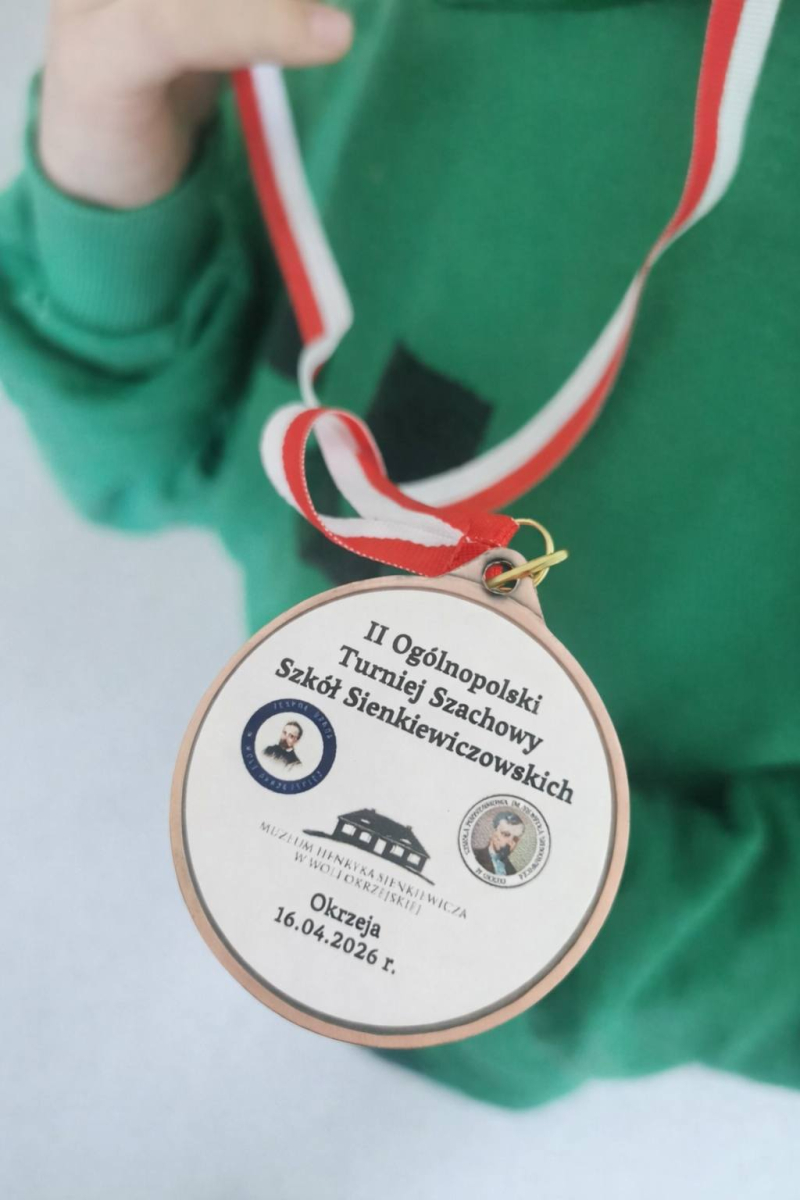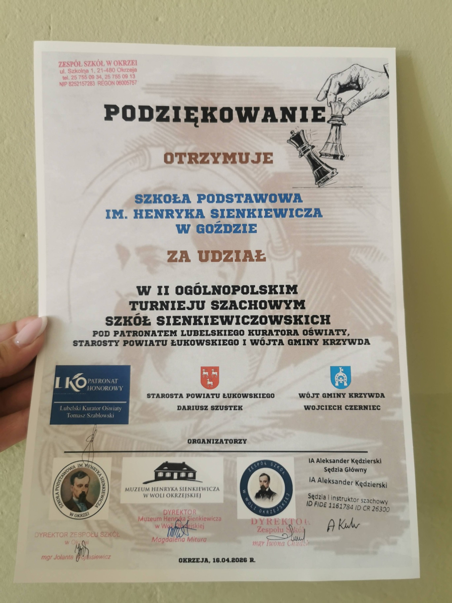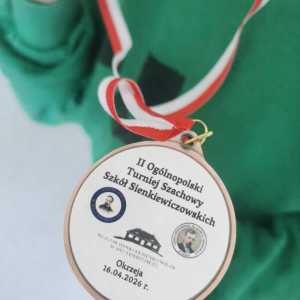 II Ogólnopolski Turniej Szachowy Szkół Sienkiewiczowskich, który odbył się 16 kwietnia 2026 r. w Dworze Sienkiewicz w Okrzei, był niezwykle interesującym i inspirującym wydarzeniem. Wzięło w nim udział ośmioro uczniów z naszej szkoły, którzy godnie reprezentowali naszą społeczność. Turniej zgromadził wielu utalentowanych młodych szachistów z różnych części kraju, co sprawiło, że rywalizacja była na bardzo wysokim poziomie. Szczególne gratulacje należą sie Julii Sowa z klasy VI, która zwyciężyła w kategorii klas V-VI, wykazując się ogromnymi umiejętnościami i opanowaniem. Jej sukces jest powodem do dumy dla całej szkoły. Atmosfera wydarzenia była bardzo przyjazna, a jednocześnie pełna sportowej rywalizacji. Serdecznie dziękujemy wszystkim naszym uczniom za udział i godne reprezentowanie szkoły.