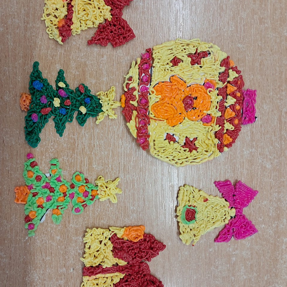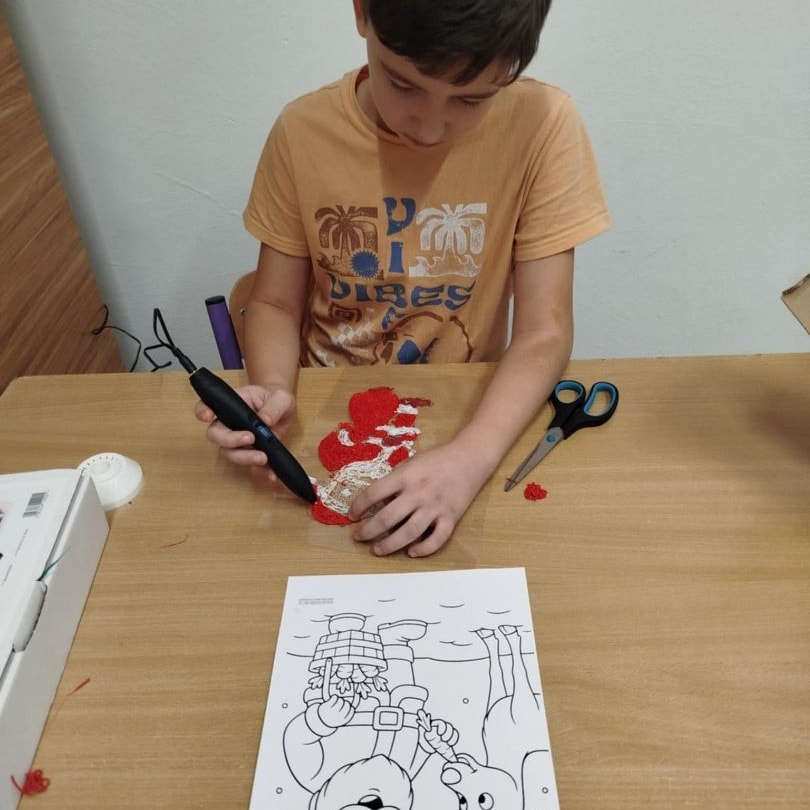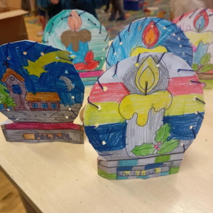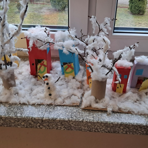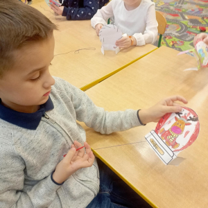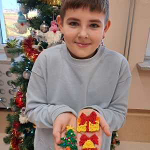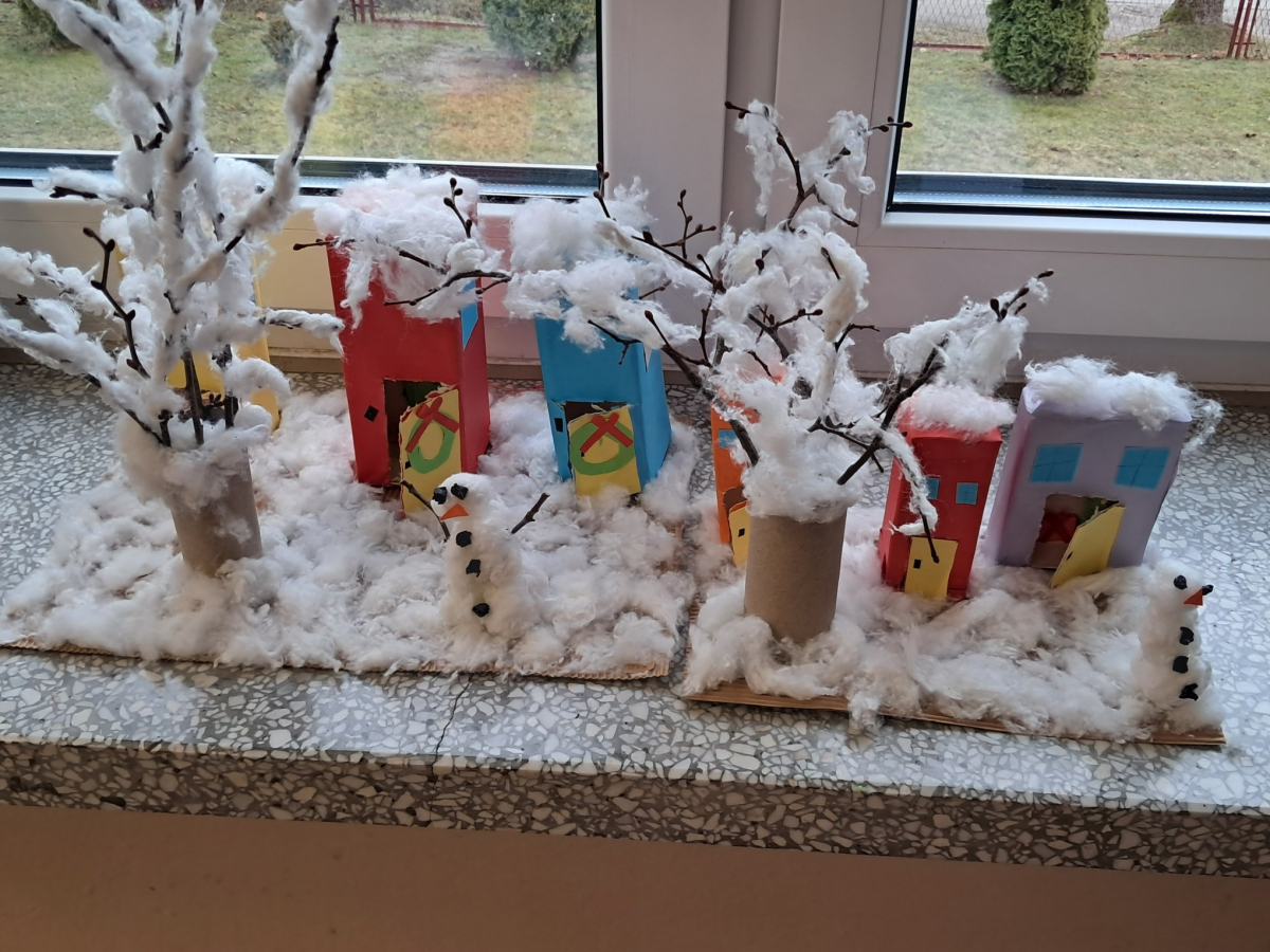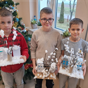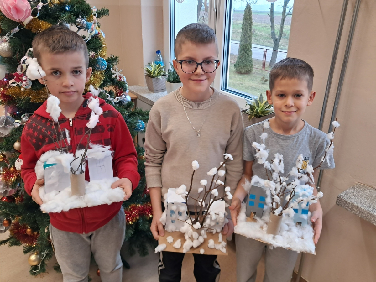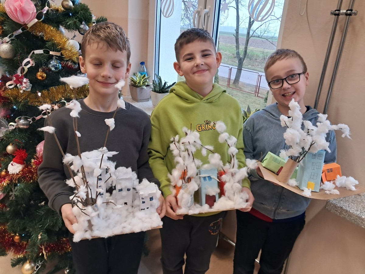 Uczniowie klasy pierwszej wykorzystali materiały papiernicze do wykonania świątecznych ozdób, rozwijając swoją wyobraźnię i zdolności plastyczne. Klasa trzecia stworzyła wyjątkową makietę „Zima w Bullerbyn”, inspirowaną omawianą lekturą. Do jej wykonania uczniowie użyli materiałów papierniczych, zaś długopisami 3D wykonali świąteczne dekoracje.