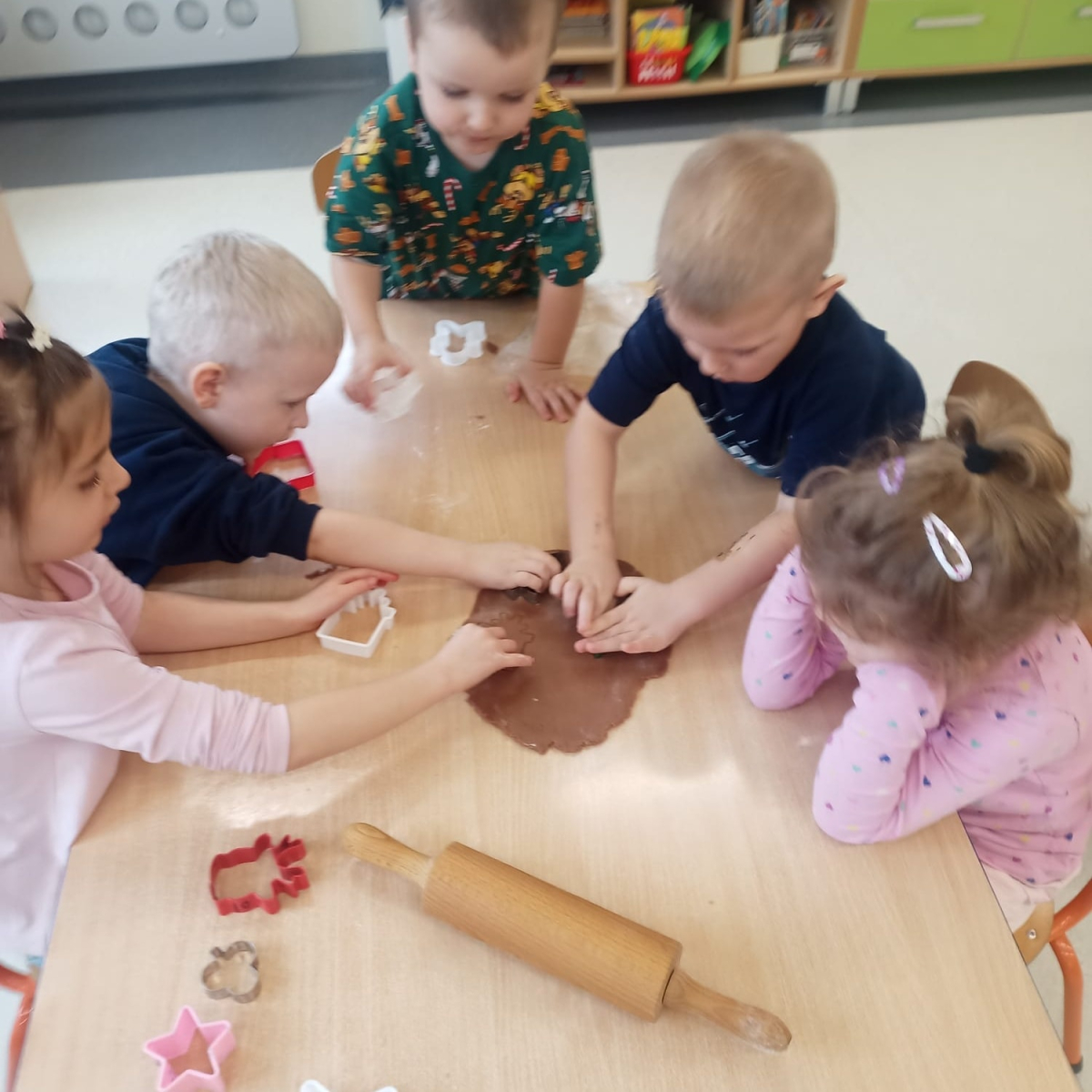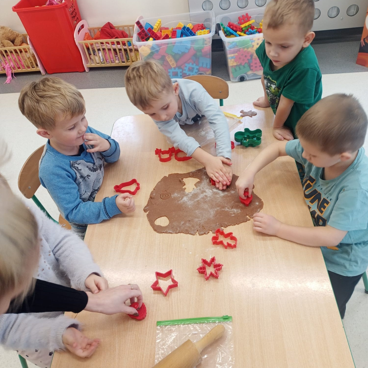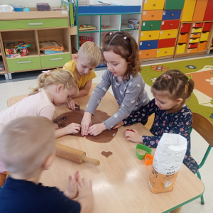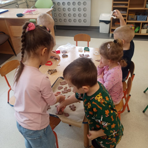 Najmłodsze przedszkolaki z ogromnym zaangażowaniem korzystały ze sprzętu AGD, piekąc świąteczne pierniki. Unoszący się w sali aromat przypraw korzennych wprowadził wszystkich w prawdziwie świąteczny nastrój. Starsza grupa przedszkolaków sięgnęła po akcesoria krawieckie, dzięki którym dzieci wyszywały kolorowe bombki, ćwicząc przy tym sprawność manualną i cierpliwość.