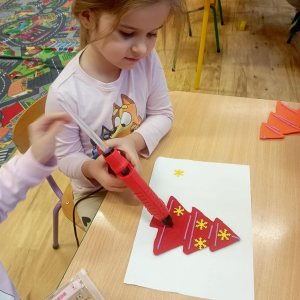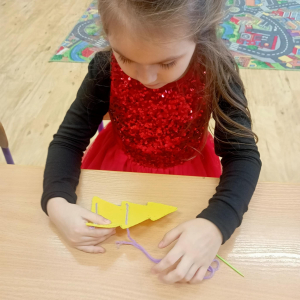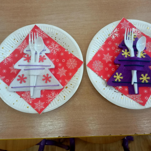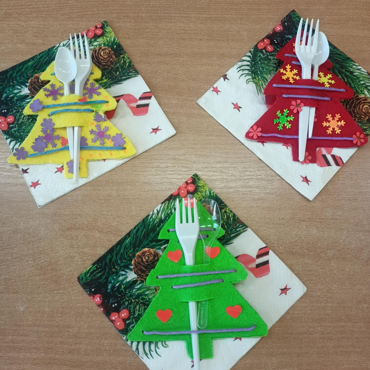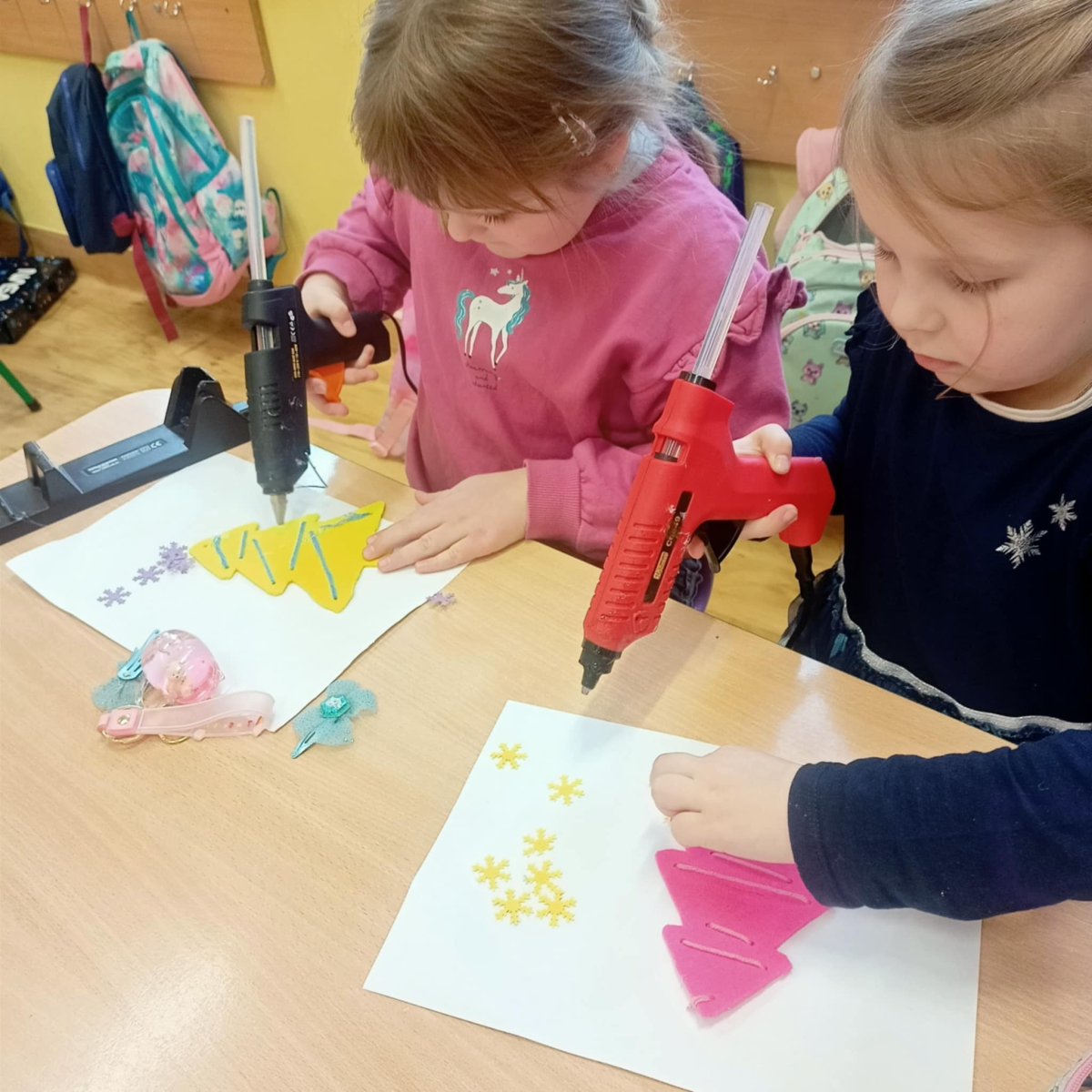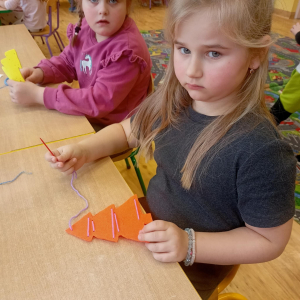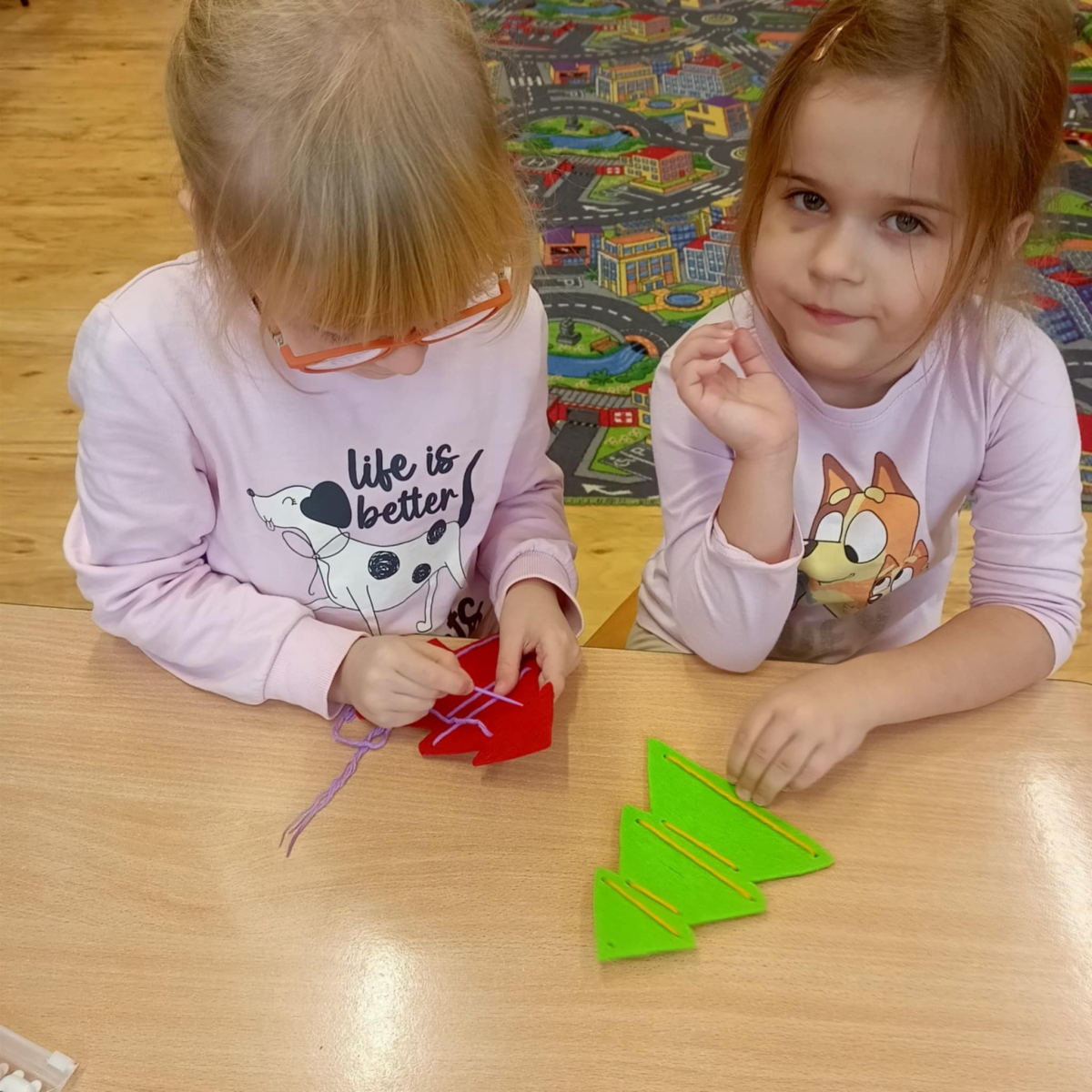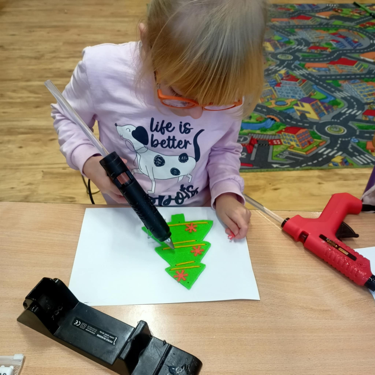 Przedszkolaki z Oddziału Przedszkolnego przygotowały świąteczne podkładki na sztućce, wykorzystując włóczkę oraz materiały papiernicze. Najmłodsi z wielkim zaangażowaniem tworzyli swoje kolorowe, świąteczne prace.