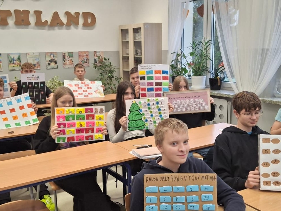 Klasa ósma przygotowała natomiast kreatywny kalendarz adwentowy, korzystając z kleju na gorąco, włóczki i materiałów papierniczych. Ich projekt wprowadził do szkoły pierwsze świąteczne akcenty.